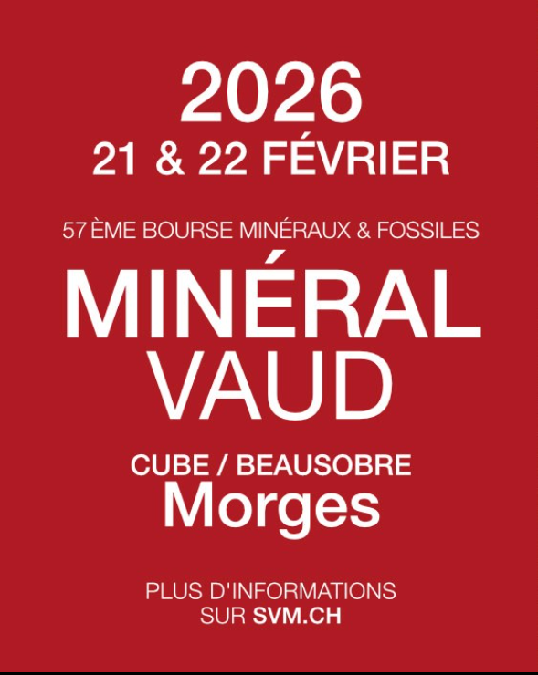 47. Mineralexpo Börse für Mineralien, Fossilien & Meteoriten; 9-18; Parc des Expositions, 120, rue Lefebvre, F-68100 Mulhouse, Autobahnausfahrt Mulhouse-Centre. V: Les Amis des Sciences de la Terre. A: H. Tischner, 18, Rue des Alpes, F-68840 Pulversheim, Tel. 0033-622-200546, E-Mail