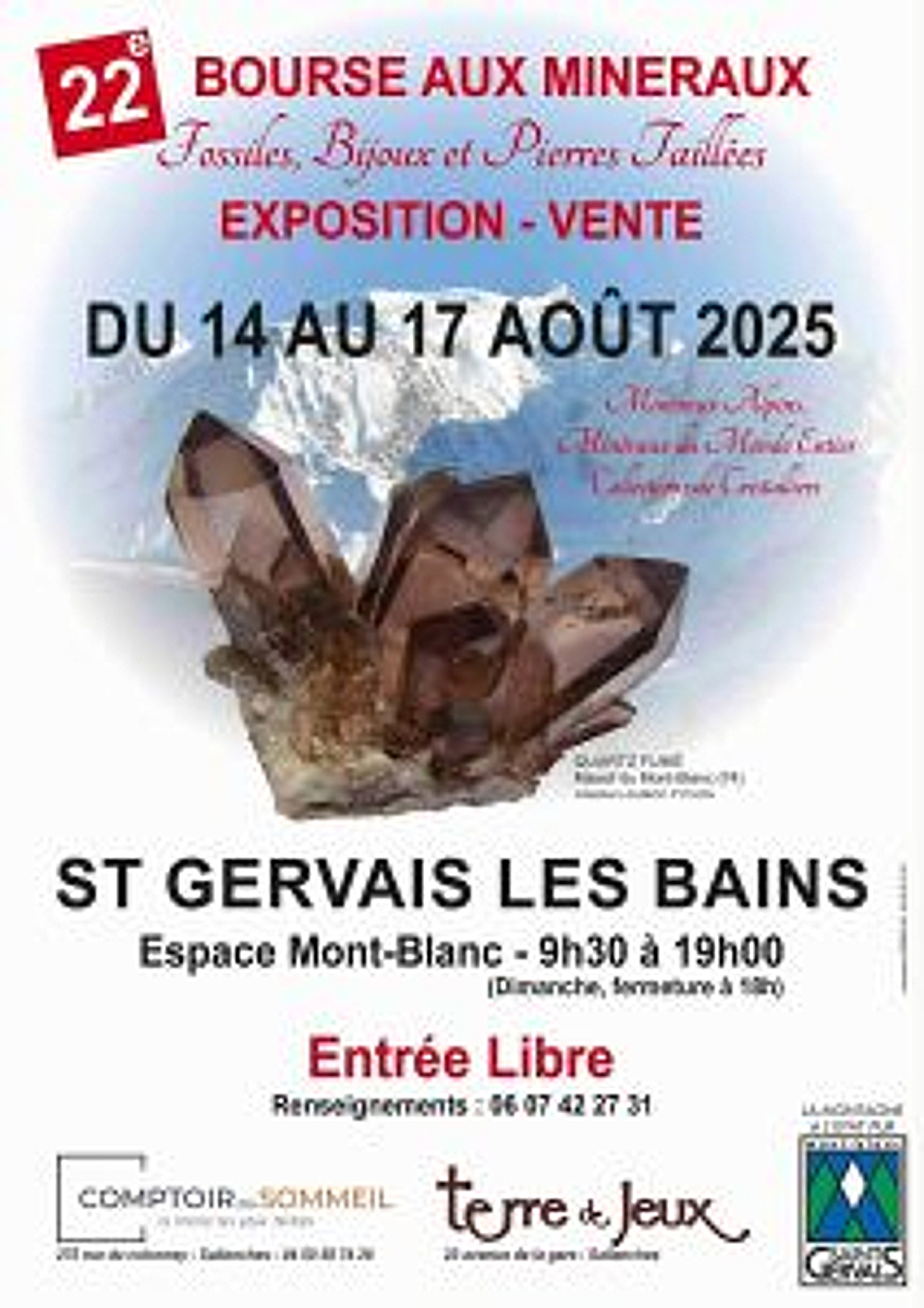 22ème Bourse aux Minéraux, Fossiles, Bijoux et Pierres taillées, Espace Mont-Blanc, Saint-Gervais-les-Bains, Contact : 06.07.42.27.31