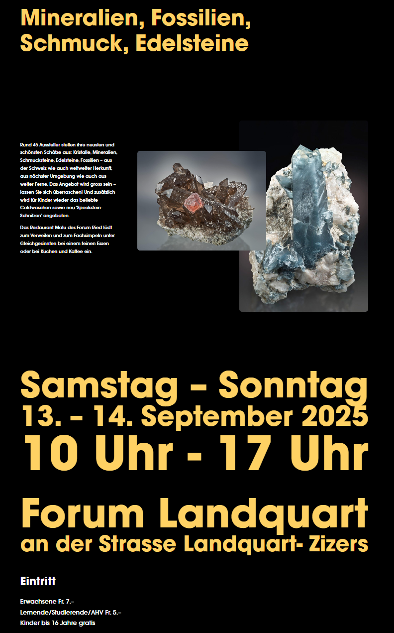 Mineralienbörse; Sa 10-17, So 10-16; Titthof, Tittwiesenstr. 8, 7000 Chur (beim Bahnhof). V./A.: Bündner Mineralien und Fossilienverein, R. Tschirky, Büelstr. 16a, Tel. +41 (0) 798321491, E-mail