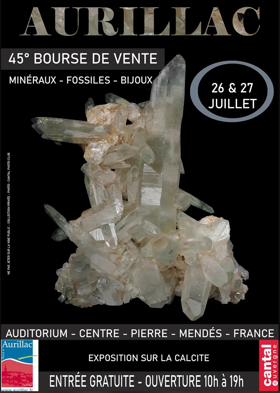 Bourse d'exposition de minéraux, fossiles et bijoux, Date: Samedi 26 juillet et Dimanche 27 juillet 2025 Organisateur : Association des Amateurs de Minéraux et Fossiles d'Aurillac,Lieu: auditorium du Centre Pierre Mendès France à Aurillac,Theme: la Calcite, Horaires : 10h-19h,Tarif: gratuit, Auditorium du Centre Pierre Mendès France,37 rue des Carmes,15000 Aurillac,FRANCE