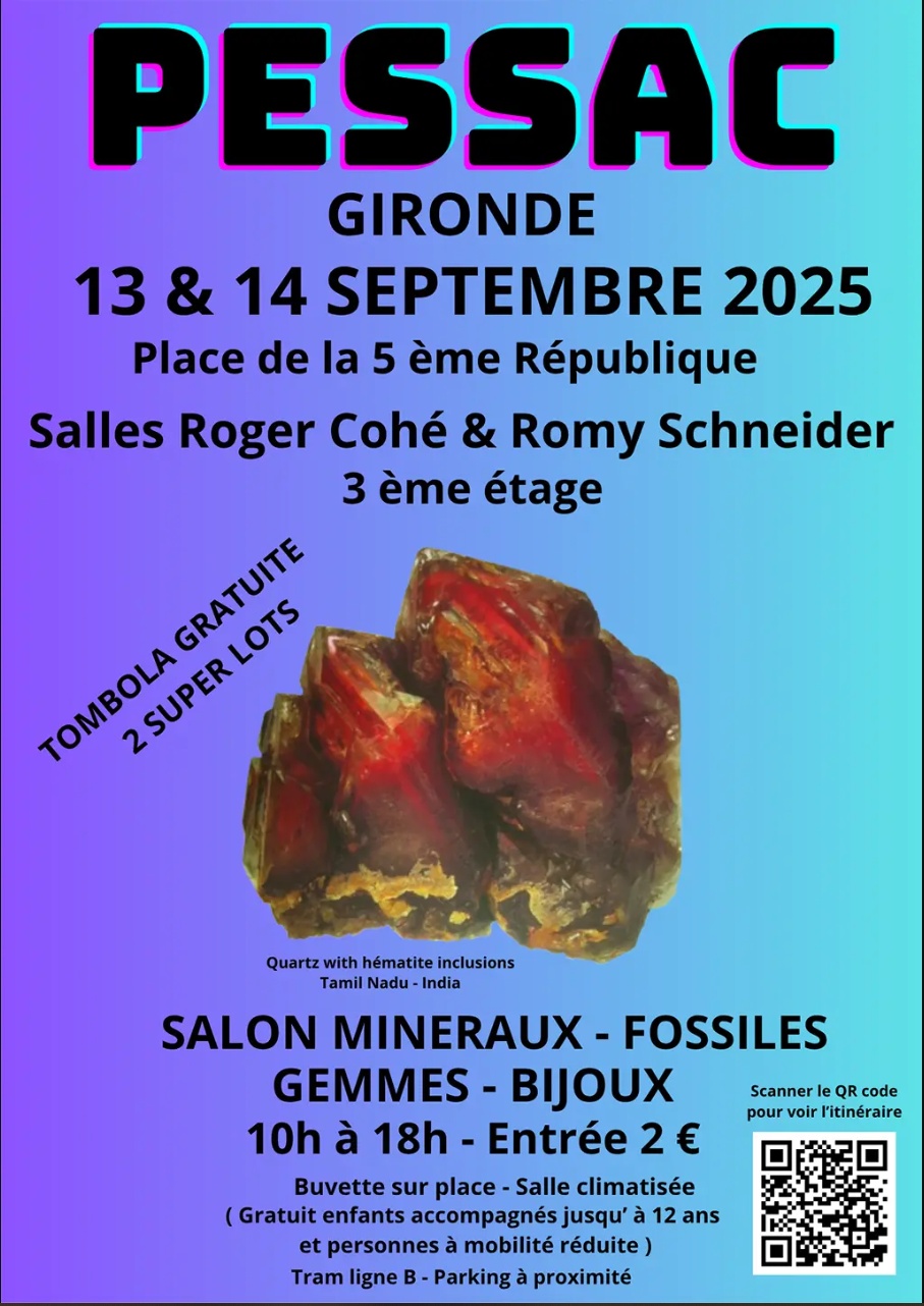 Salon minéraux, fossiles, bijoux de créateur. Ville de Saint Palais-sur-Mer (17420) à coté de RoyanSalle des fêtes 31 rue du logis vert les 12 et 13 Juillet 2025,Samedi de 10h à 19h,Dimanche de 10h à 18h Entrée gratuite !Parkings gratuits !Exposants professionnels