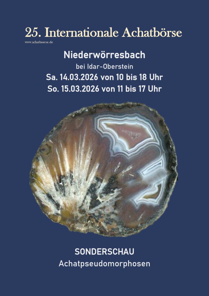 25. Internationale Achatbörse; Sa 10-18, So 10-17; Mehrzweckhalle und Großsporthalle, Mühlenweg 2, 55758 Niederwörresbach. V./A: Achatwelt UG, B. Hemmer, Bühlertalstr. 26, 77815 Bühl, Tel. 07223-911843, E-Mail